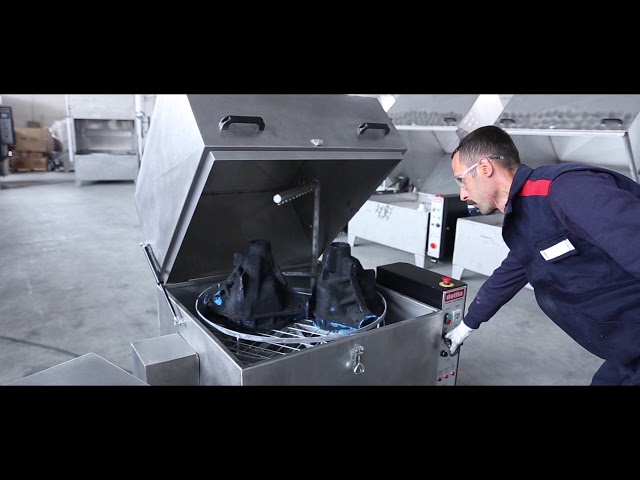 The washing process is highly efficient, utilizing a rotating basket mechanism that spins the parts around their axis while they are subjected to high-pressure jets of hot water and cleaning agents. This combination of pressure, temperature, and chemical action effectively removes all dirt and grime from the parts.